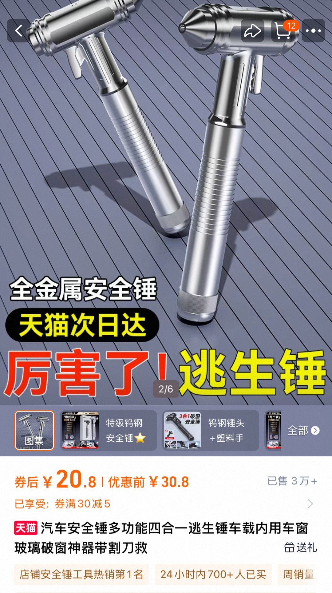 “顾客通常都会咨询能不能、如何能击碎汽车玻璃?”特别是随着双层夹胶玻璃在新能源汽车中的普及,破窗锤的有效性更受关注。该工作人员表示,目前店铺内最畅销的是锤型全金属破窗锤,集尖锤、平锤、安全带割刀于一体,因造型通俗易懂、使用简单而受消费者青睐。