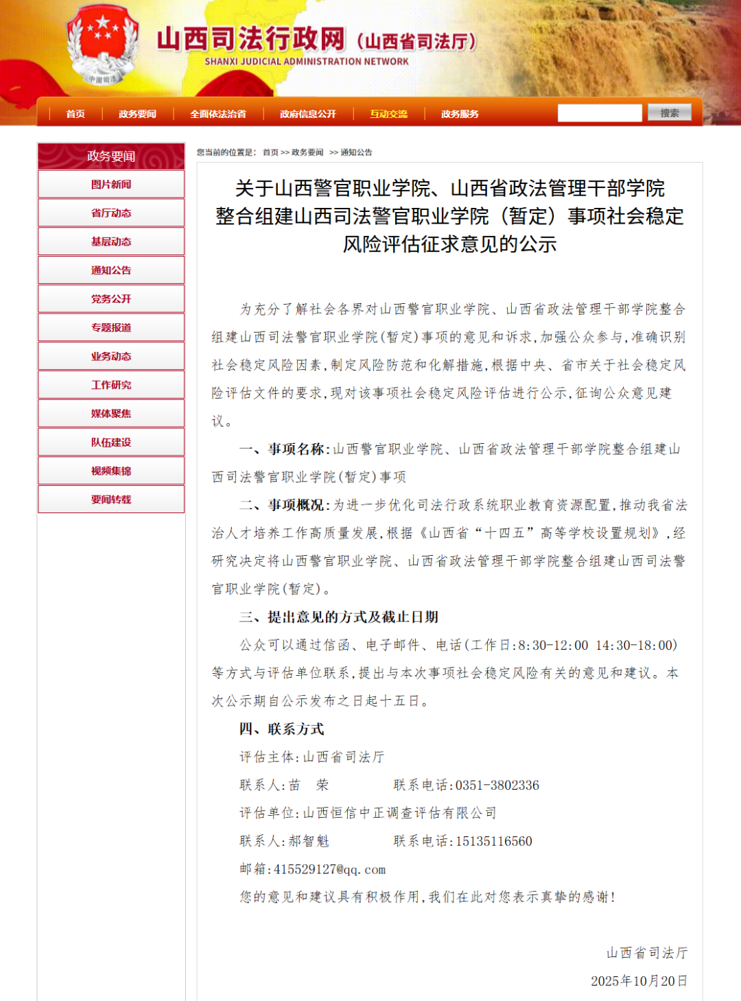日前,山西省司法厅发布公示,正式启动山西警官职业学院与山西省政法管理干部学院整合组建山西司法警官职业学院(暂定)的社会稳定风险评估征求意见工作。