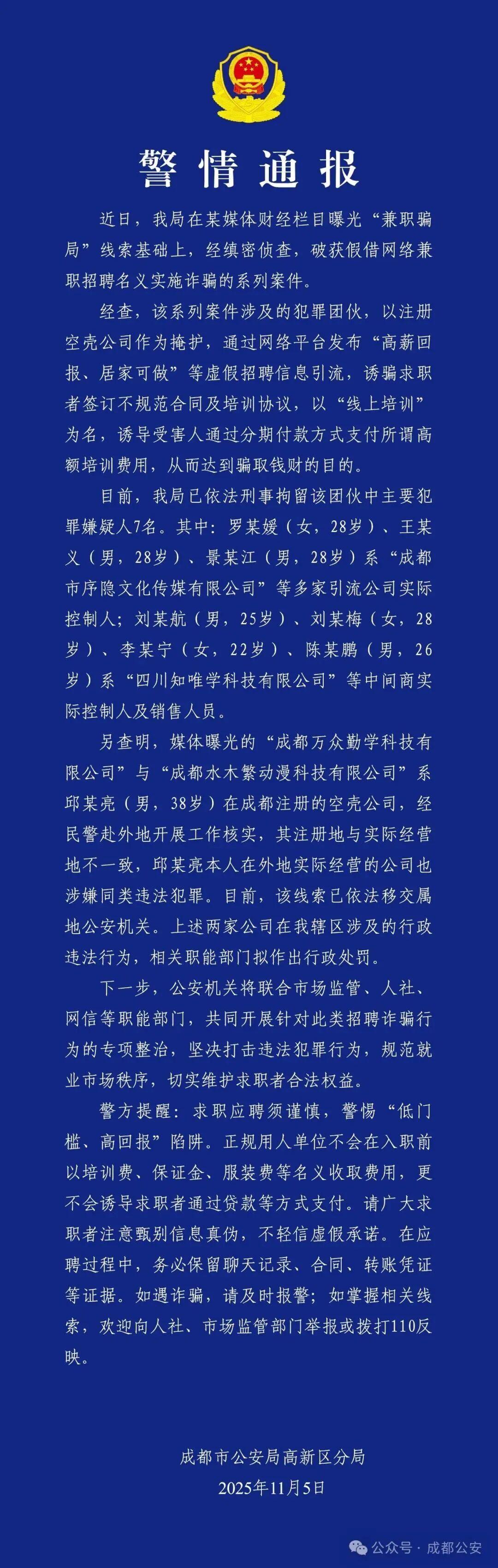 11月5日晚,成都市公安局高新区分局发布警情通报称,经查,该系列案件涉及的犯罪团伙,以注册空壳公司作为掩护,通过网络平台发布“高薪回报、居家可做”等虚假招聘信息引流,诱骗求职者签订不规范合同及培训协议,以“线上培训”为名,诱导受害人通过分期付款方式支付所谓高额培训费用,从而达到骗取钱财的目的。