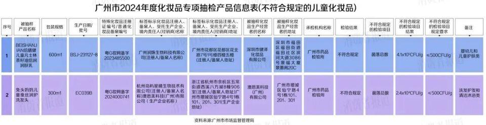 不符合规定的样品分别是标称“BEISHANJIAN倍膳健儿童凡士林茶籽油倍润润肤乳(批次号BSJ-231127-8)”,以及标称“兔头妈妈儿童蚕丝润护洗发水(批次号EC039B)”的产品,菌落总数分别为国家规定限值(≤500 CFU/g)的820倍、48倍。