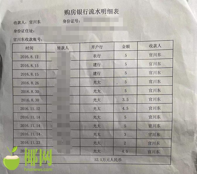 记者从郭先生提供的《购房银行流水明细表》中看到,从2016年8月12日至2016年11月25日,郭先生和王女士多次以网上支付的方式,向“官川东”的账户转账共计52.5万元人民币。其中,2016年8月12日到8月15日的三笔转账共15万元,是由王女士直接转账到“官川东”的账户,之后的转账均以郭先生的名字操作。