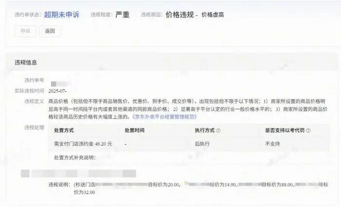 京东外卖的处罚截图。受访者供图