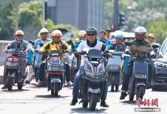 资料图:外卖骑手正在骑车配送外卖。中新社记者 贾天勇 摄