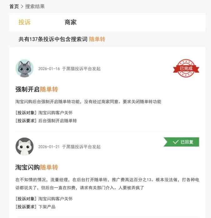 某消费投诉平台上关于外卖平台“随单转”的投诉。