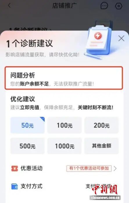 某外卖平台为商家店铺提供的诊断建议。受访者供图