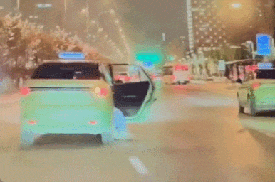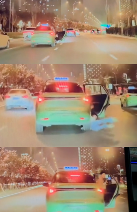 网传视频显示,出租车先是行驶状态,后排车门突然打开,随后车辆亮起双闪,后排伸出来一双脚;随后,一女子从车内掉出摔在地上,过程中,车辆仍是行驶状态;随后,车辆停止,后排又下来一名乘客。